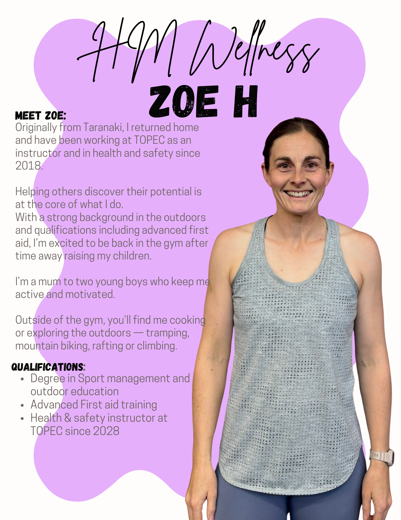 A Taranaki local, Zoe brings a passion for helping others discover their potential. With a background in sport management, outdoor education, and advanced first aid, she’s back in the gym after raising her two boys. Outside of training, Zoe loves exploring the outdoors through tramping, mountain biking, rafting, and climbing.