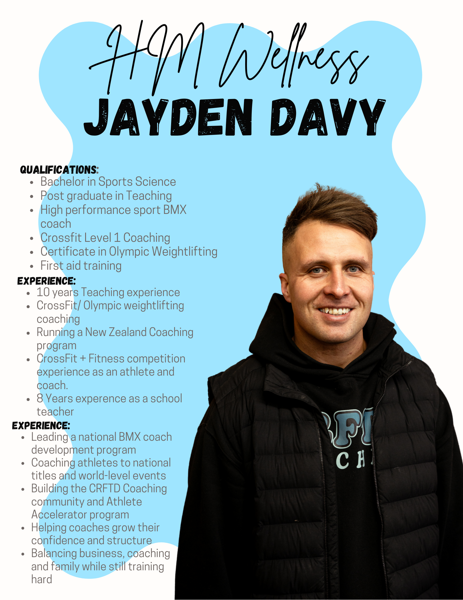 With a background in sports science, teaching, CrossFit, Olympic lifting, and high-performance BMX, Jayden specialises in building confident athletes and coaches. He leads national-level programs, develops future talent, and still trains hard alongside it all.